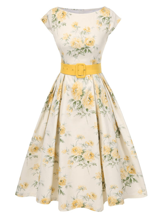 [Przedsprzedaż] Żółta sukienka w kwiaty z lat 50. w stylu antycznym z dekoltem w łódkę z paskiem