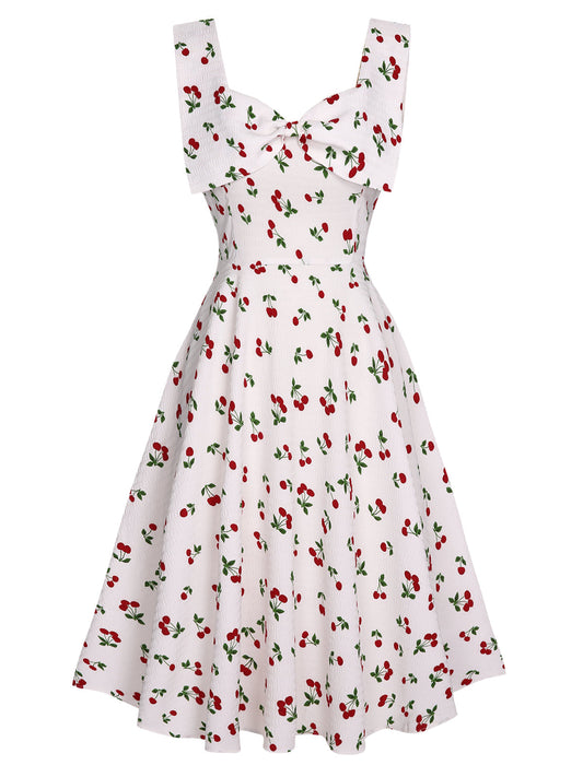 Biała, wiśniowa sukienka z dekoltem w serek z lat 50. z kokardą