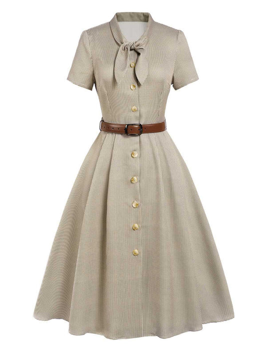 Brązowa sukienka w kratę z lat 40. z kołnierzykiem z muszką