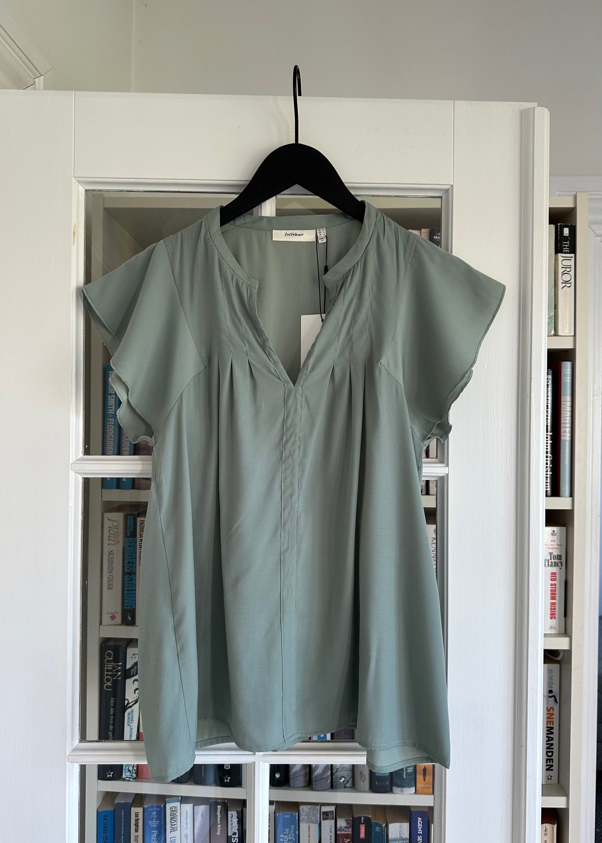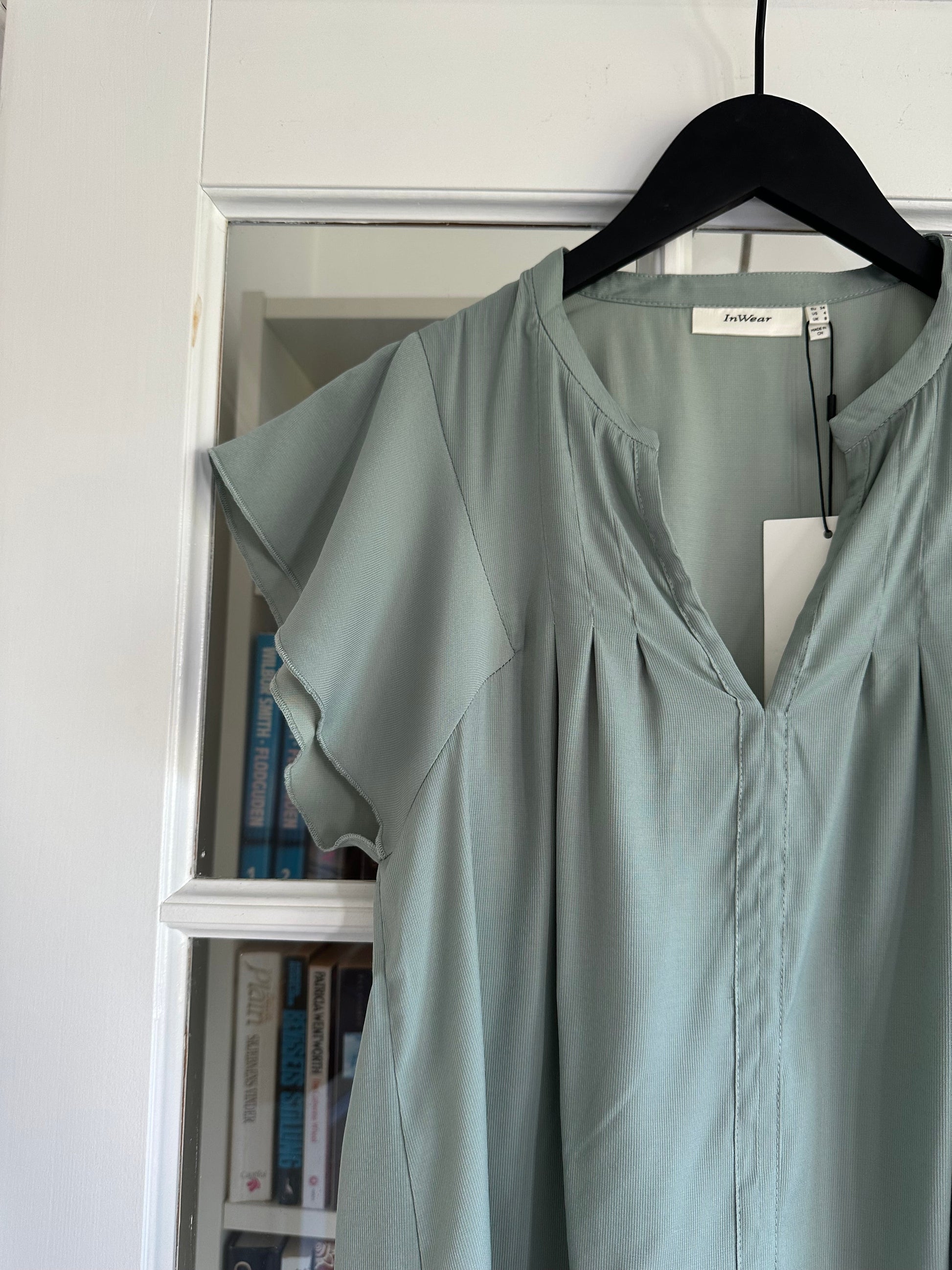 Piękny, przydymiony, zielony top marki InWear. Bluzka ma luźny krój, krótkie rękawy i dekolt w serek. Suknia ma piękne detale w postaci plis na ramionach, dzięki czemu pięknie się układa.