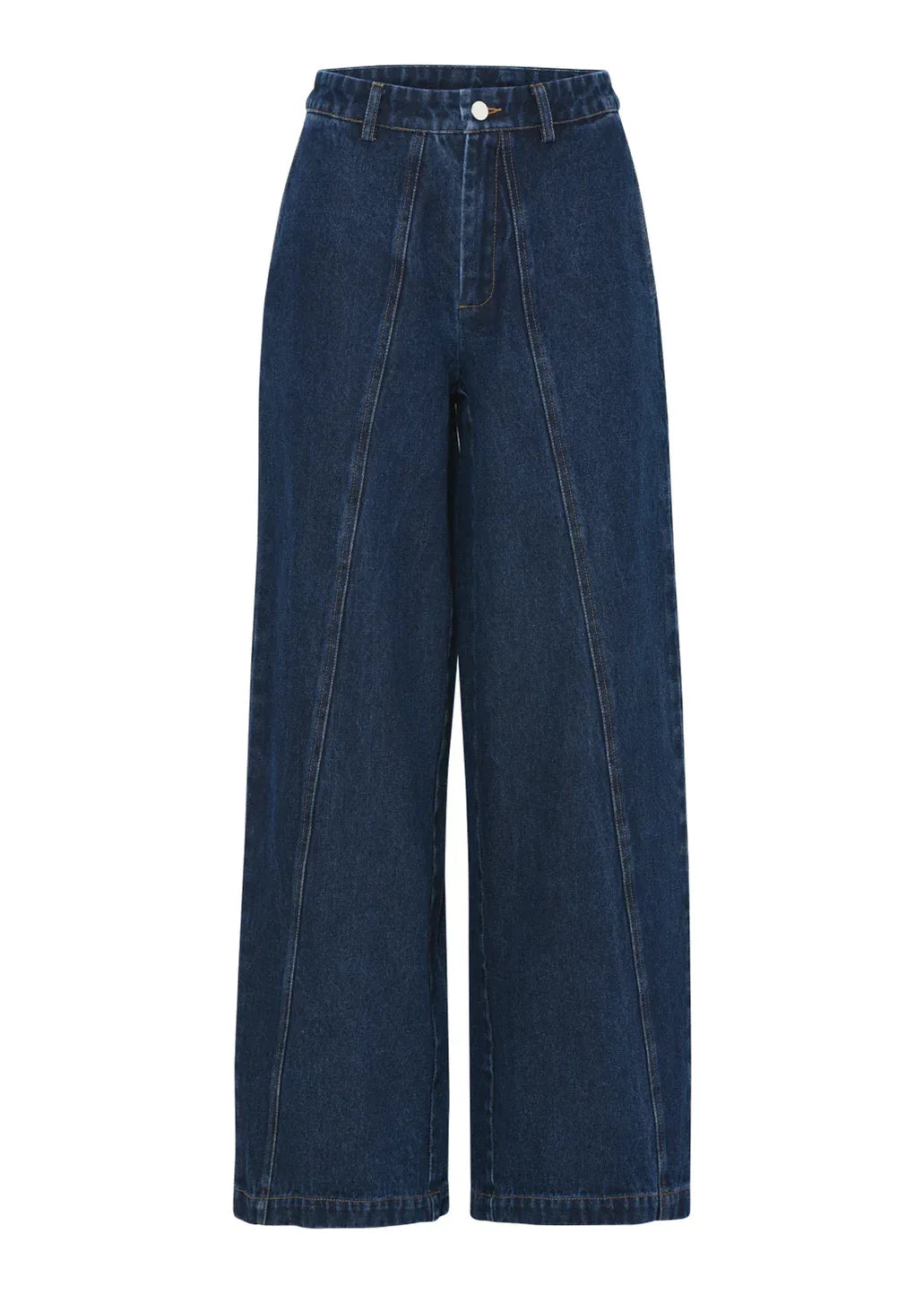 Modne jeansy ze skośnymi szwami marki La Rouge. Jeansy mają wysoki stan, bardzo szerokie nogawki, zapinane są na guzik i zamek błyskawiczny. Posiadają szlufki na pasek, kieszenie boczne i ozdobne kieszenie z tyłu.
