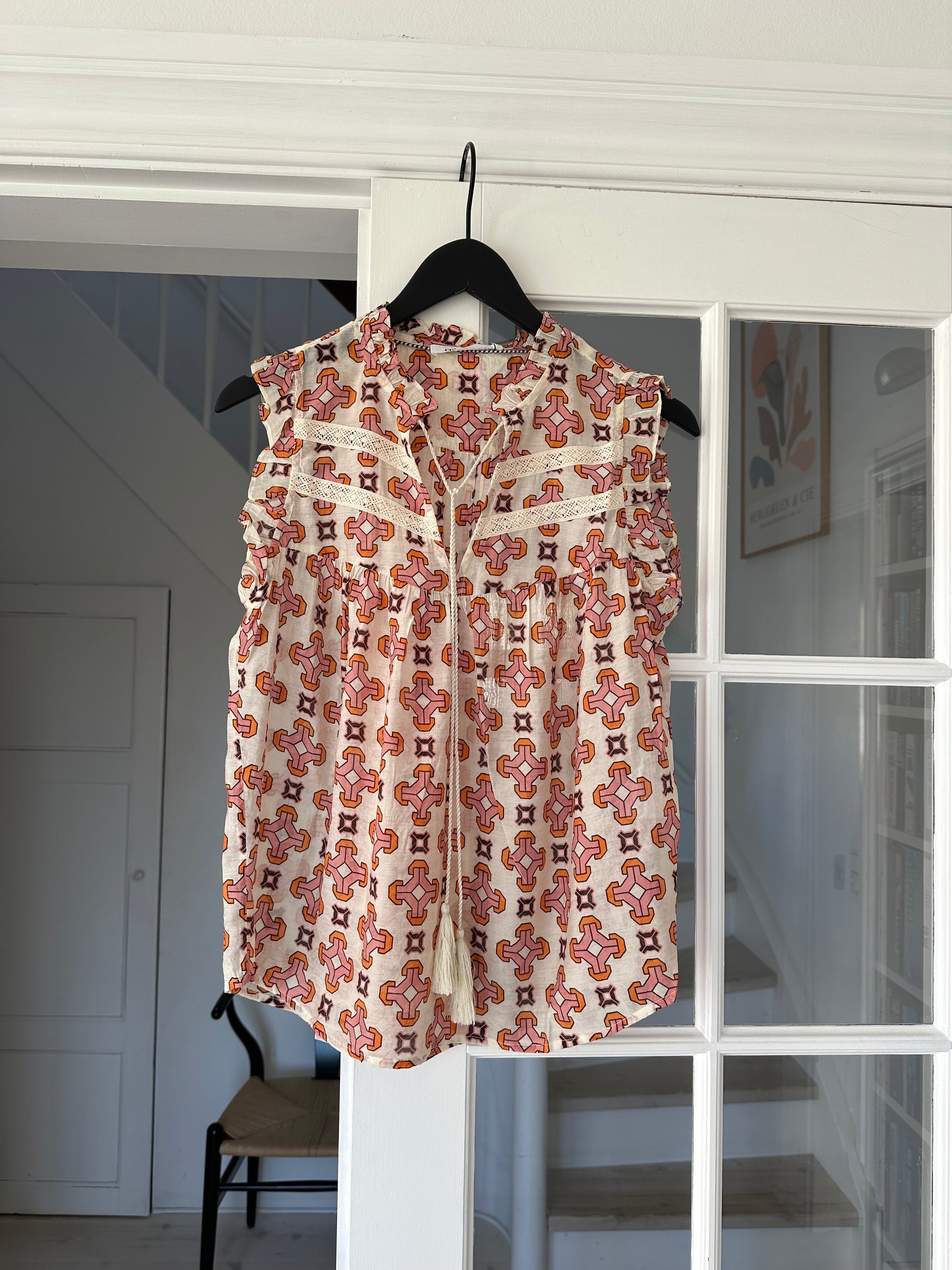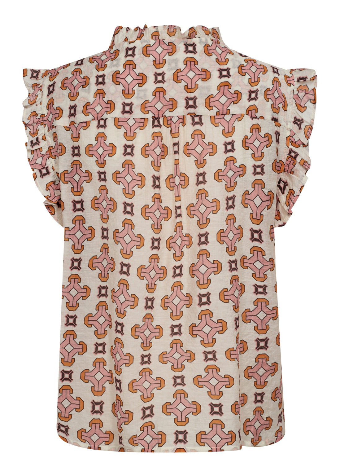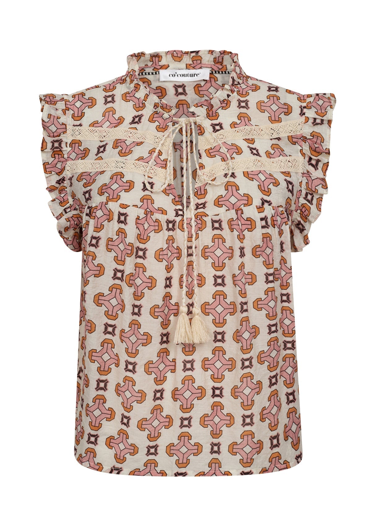 Piękny top marki Co'Couture z brązowym wzorem, małą falbanką przy kołnierzyku i wiązaniem przy szyi, dekoltem w serek i małą falbanką na ramionach.