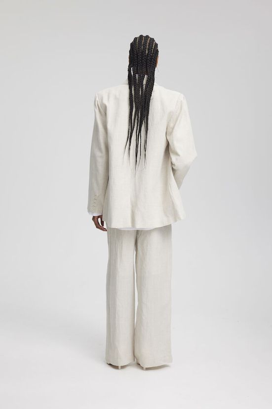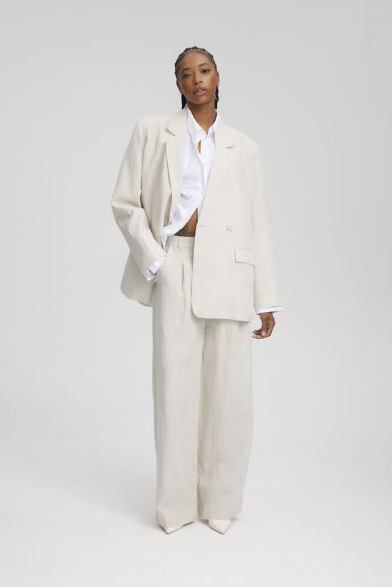 Piękna, lekka lniana marynarka od Gestuz. Marynarka jest dwurzędowa, ma luźny krój i guziki z przodu. Marynarka pasuje do spodni LizaGZ, ale świetnie prezentuje się także sama.
