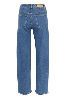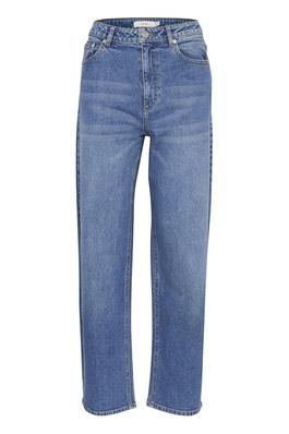 Modne jeansy z wysokim stanem marki InWear w klasycznym niebieskim kolorze. Jeansy mają klasyczne pięć kieszeni i zamek błyskawiczny, wysoki stan i luźne, lekko zwężane nogawki.