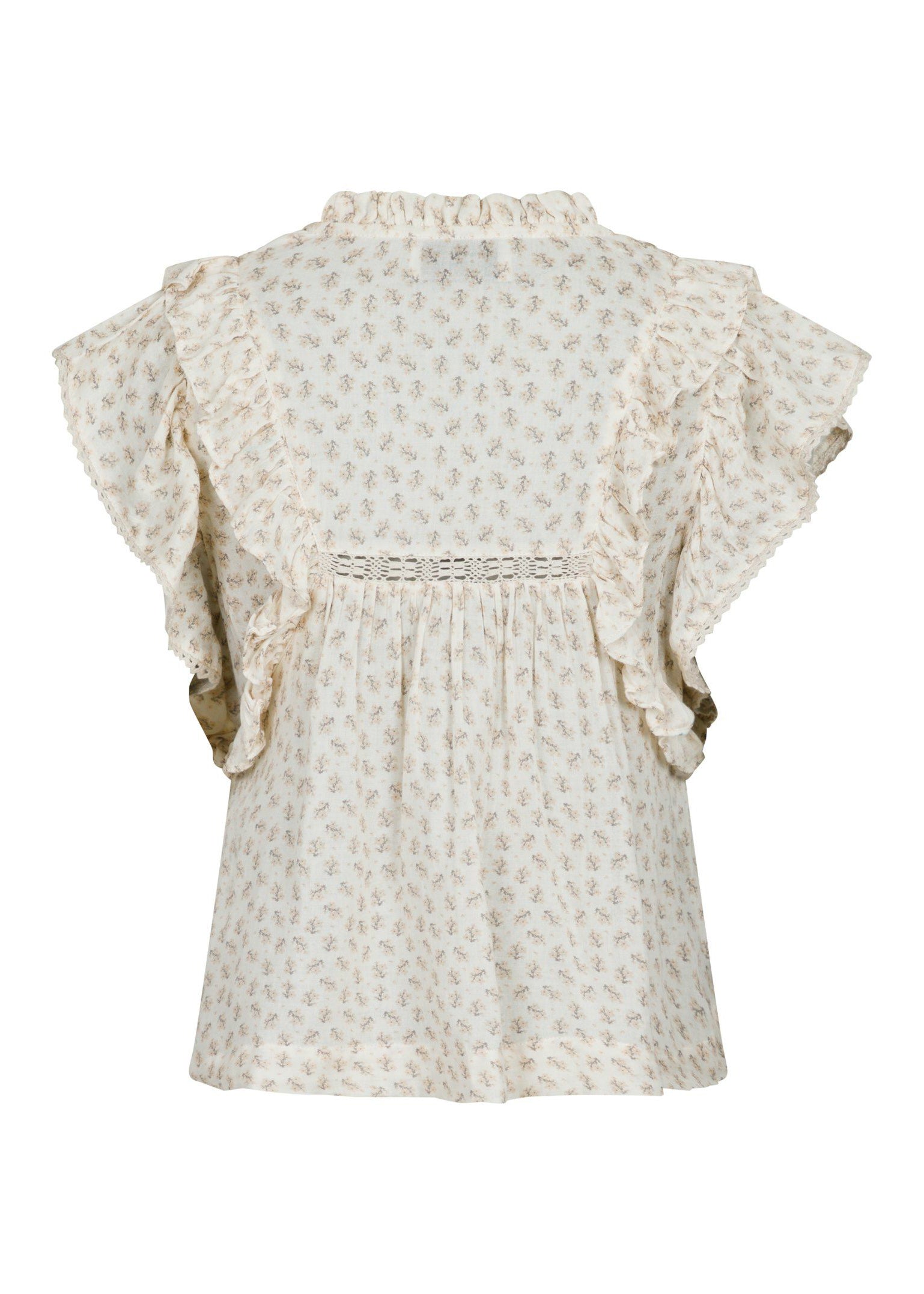 Piękny kwiatowy top od Neo Noir. Góra ma luźny krój, krótkie rękawy i dekolt w serek. Ozdobiona jest pięknymi detalami w postaci marszczonych krawędzi przy rękawach i kołnierzyku oraz koronkowego wzoru na klatce piersiowej.