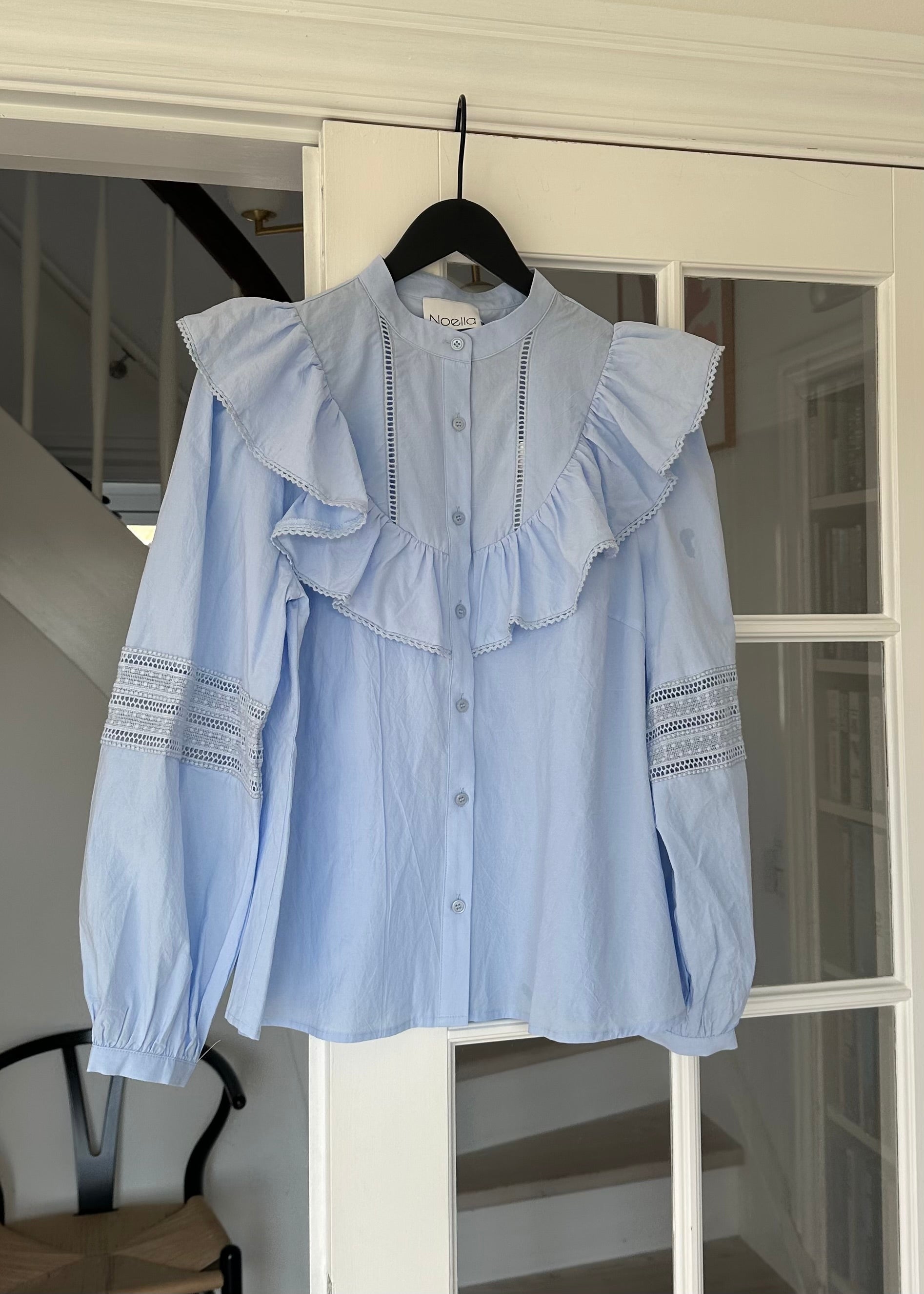 Piękna koszula z falbankami od Noelli. Koszula ma luźny krój, długie rękawy i okrągły dekolt. Zapinana jest na całej długości na guziki i ma ładny wzór dziurek.