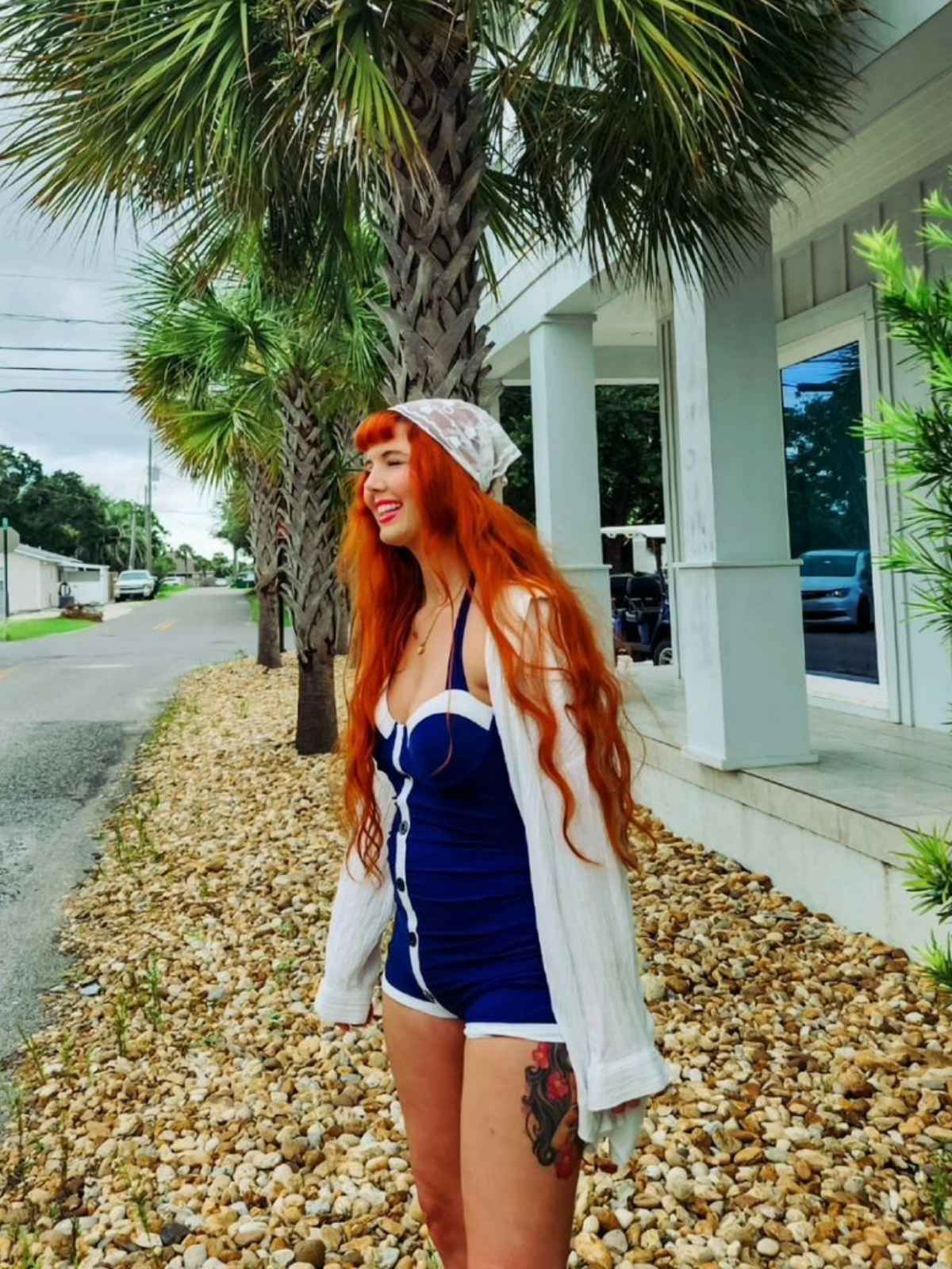 Dwuczęściowa bluzka w paski z lat 50. i plisowana spódnica