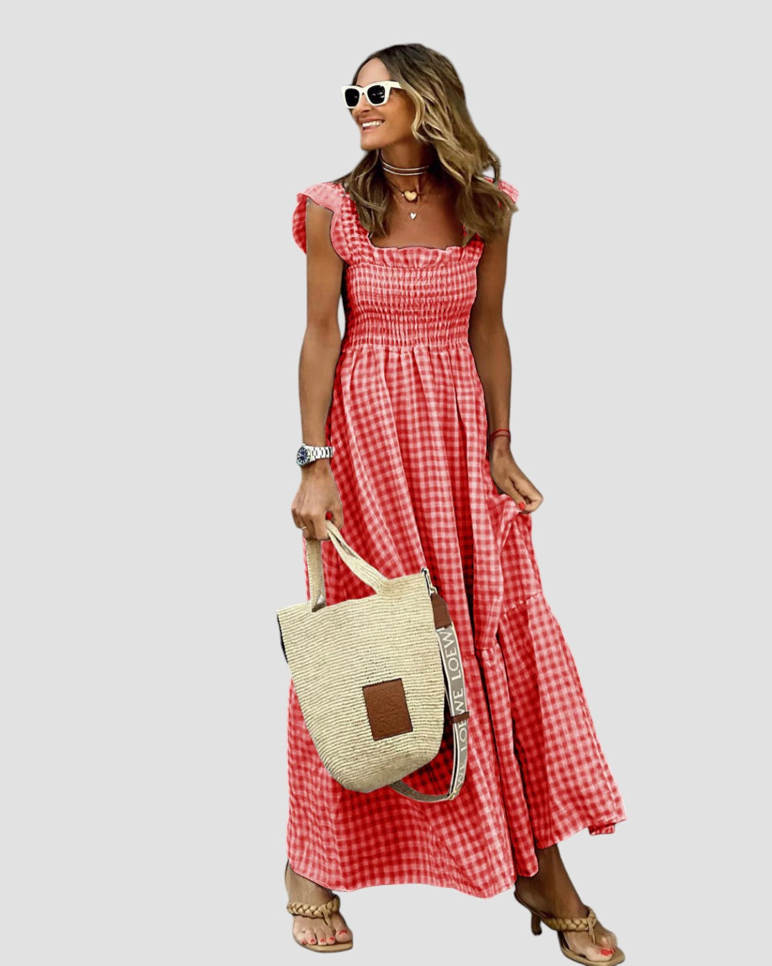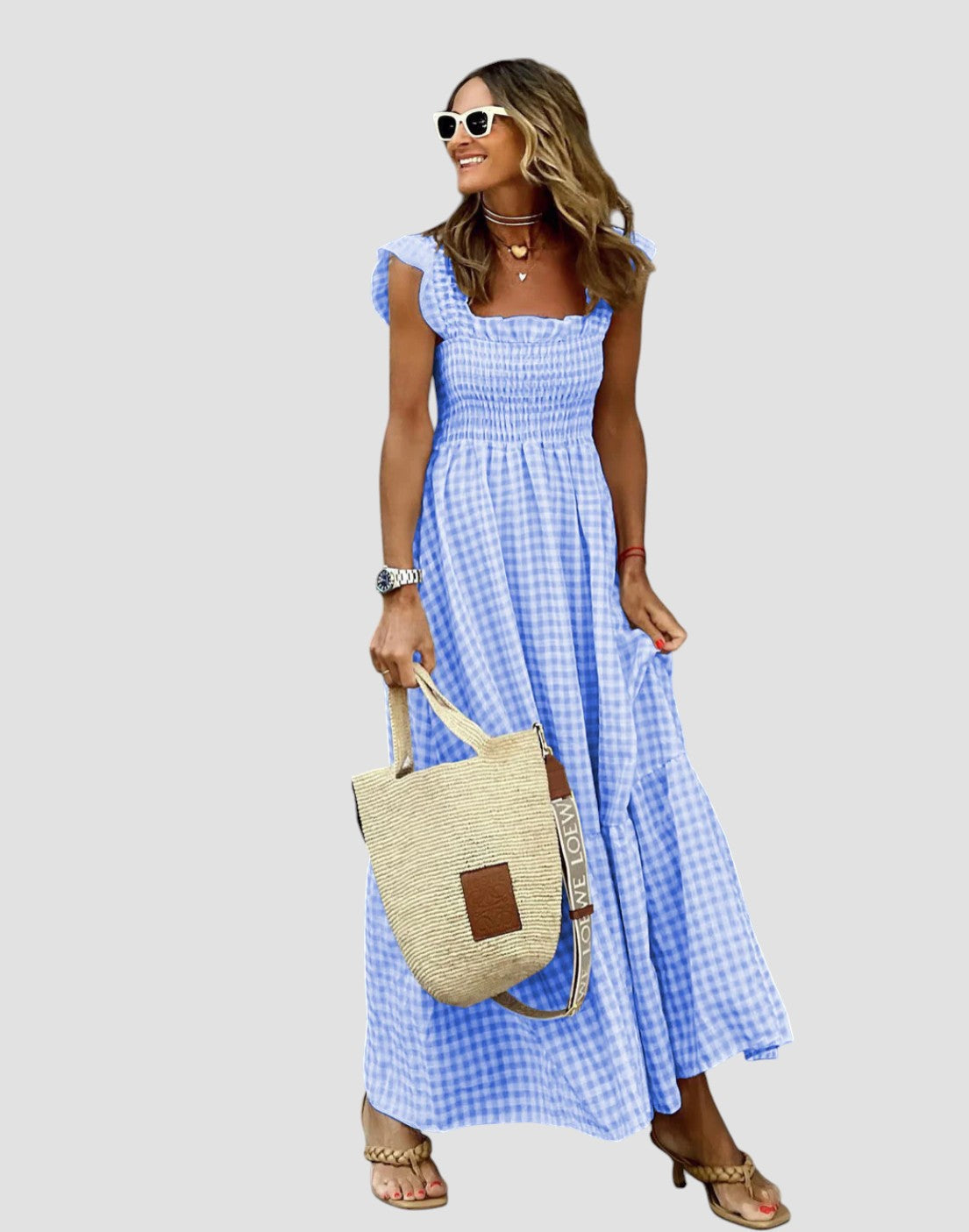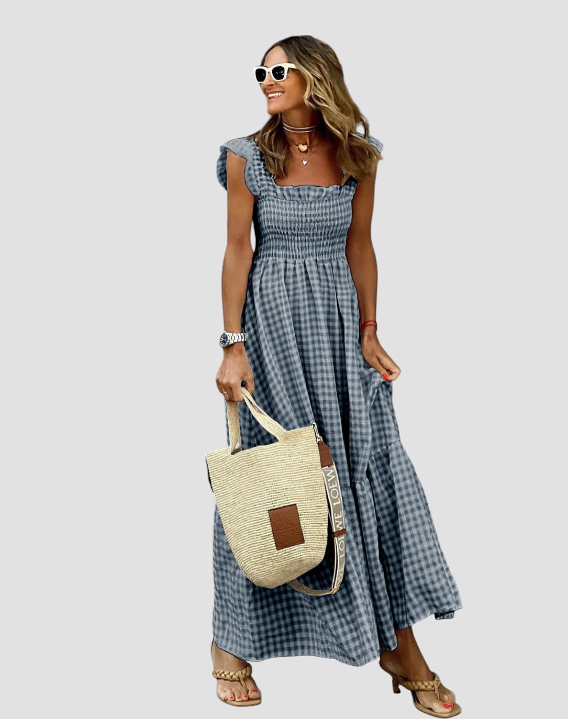 Sukienka Manuela łączy w sobie kobiecy urok i radosny design. Falbany swobodnie opadają z ramion, a kratkowane, falbaniaste rękawy dodają wyjątkowego charakteru. Idealne miejsce na kolację pod gwiazdami lub wieczorny spacer po plaży.