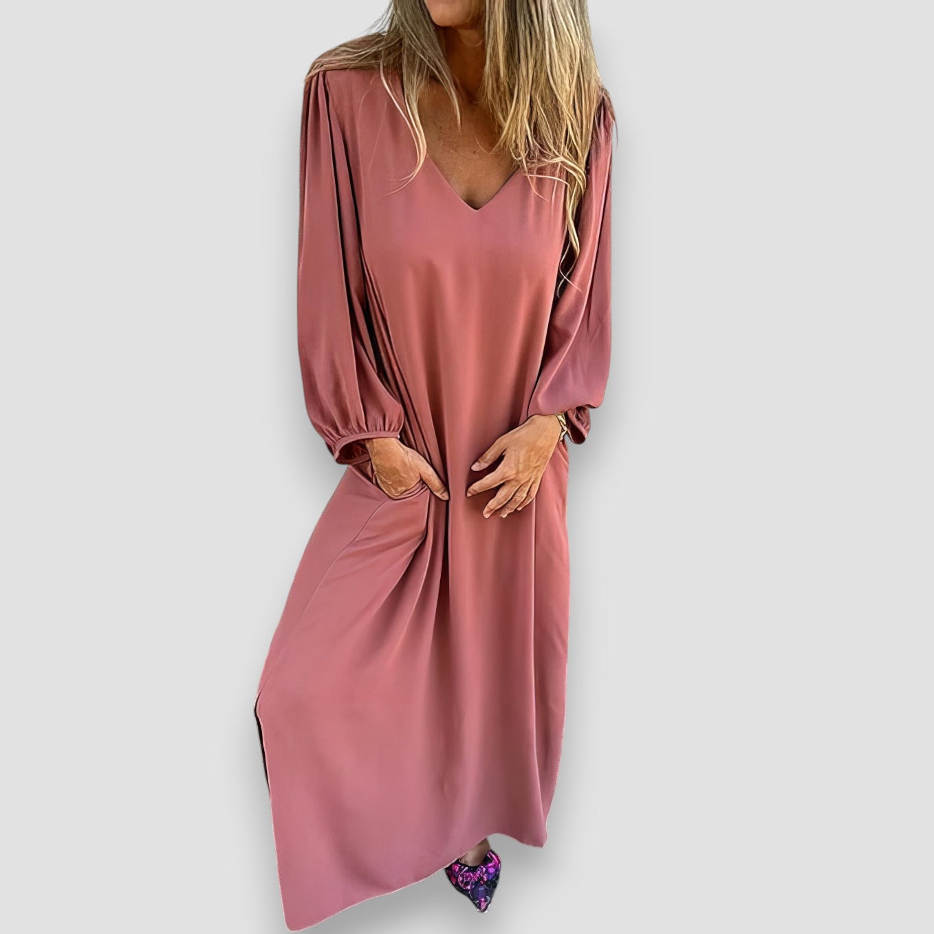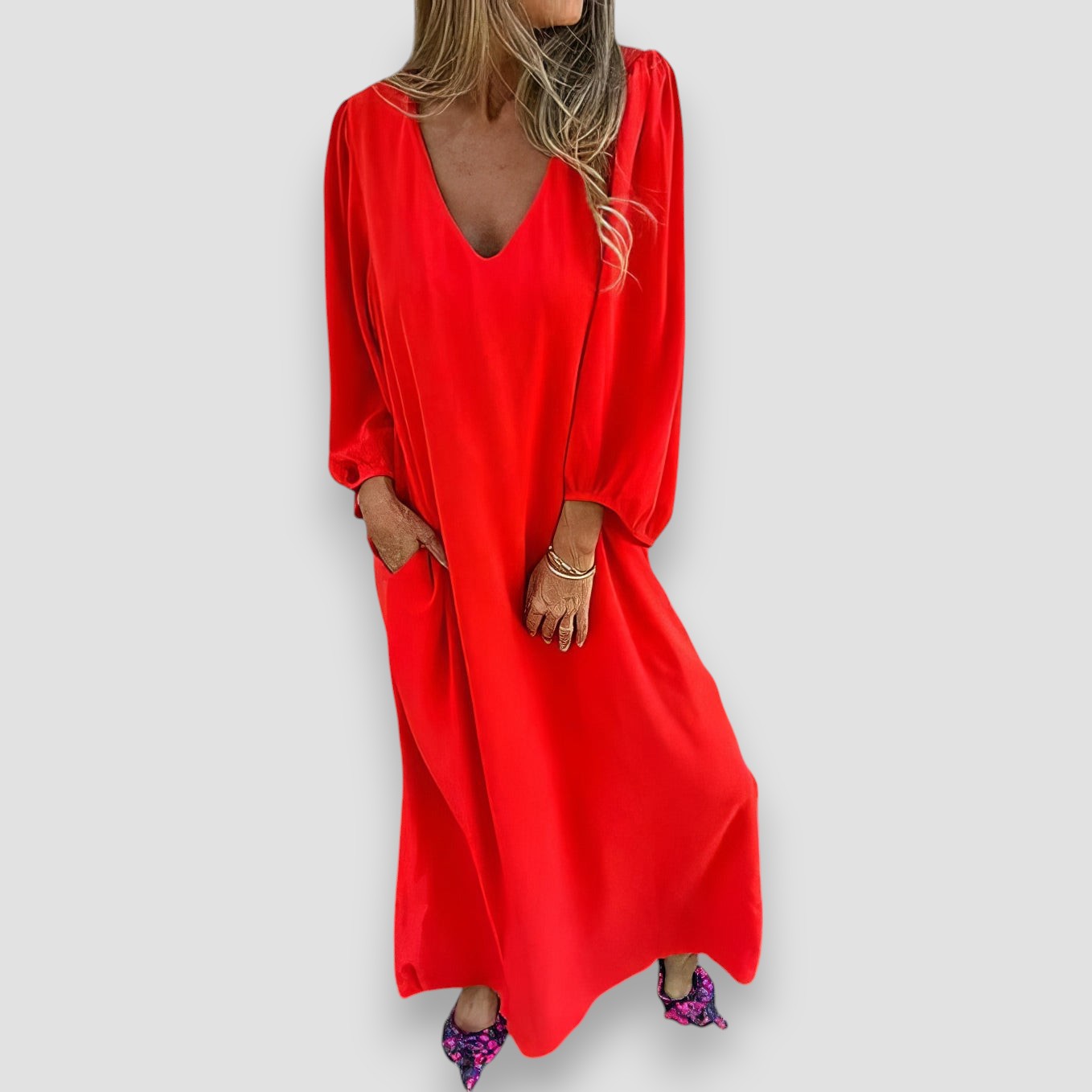 Sukienka w stylu boho Néroli łączy w sobie styl i wygodę, zapewniając wyrafinowany wygląd. Dekolt w serek i luźny krój sprawiają, że jest to idealny wybór, jeśli zależy Ci na swobodnym i eleganckim wyglądzie.