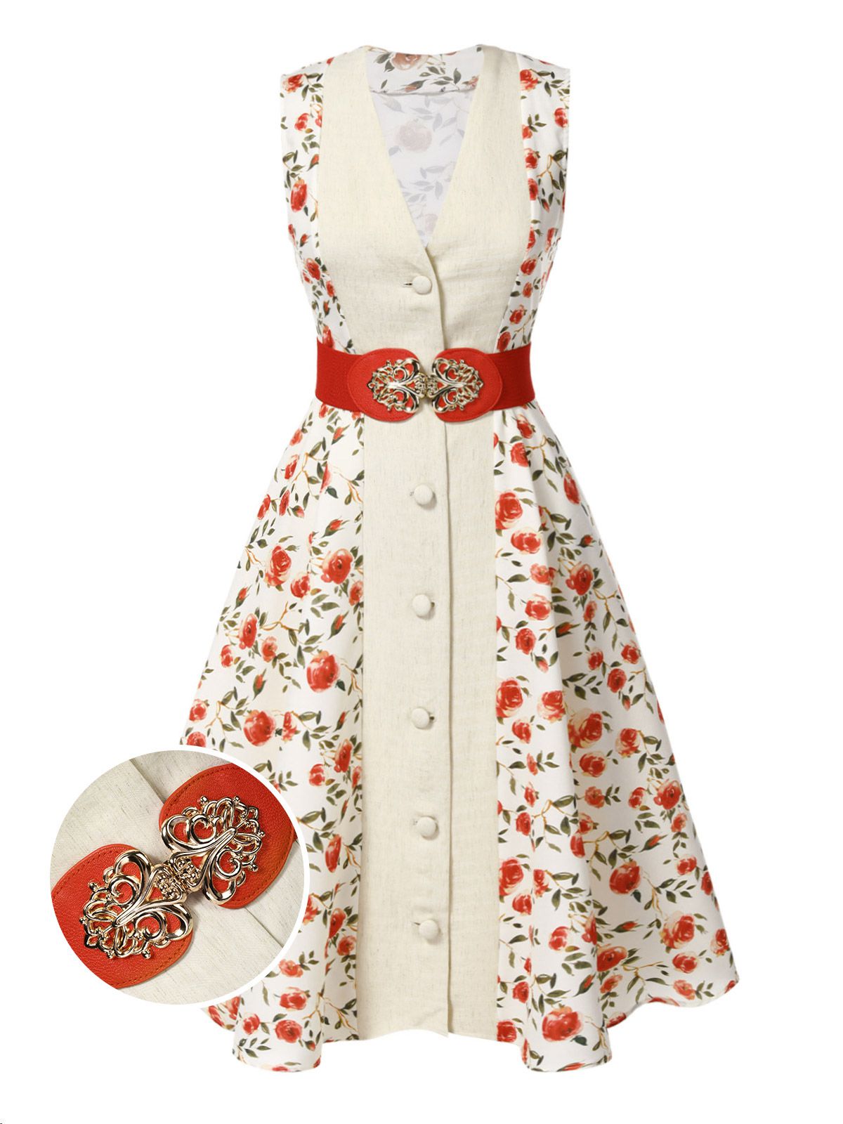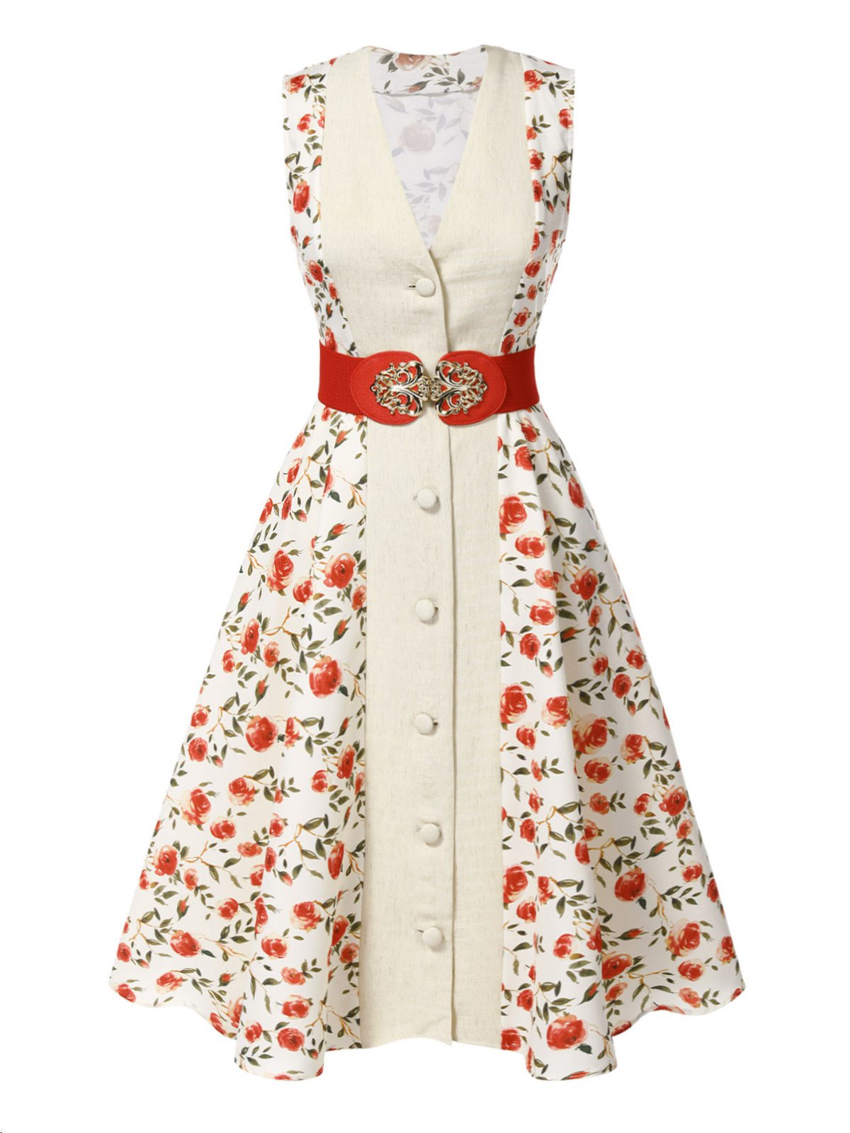 / Sukienka z paskiem w kolorze beżowo-czerwonej róży z lat 50.