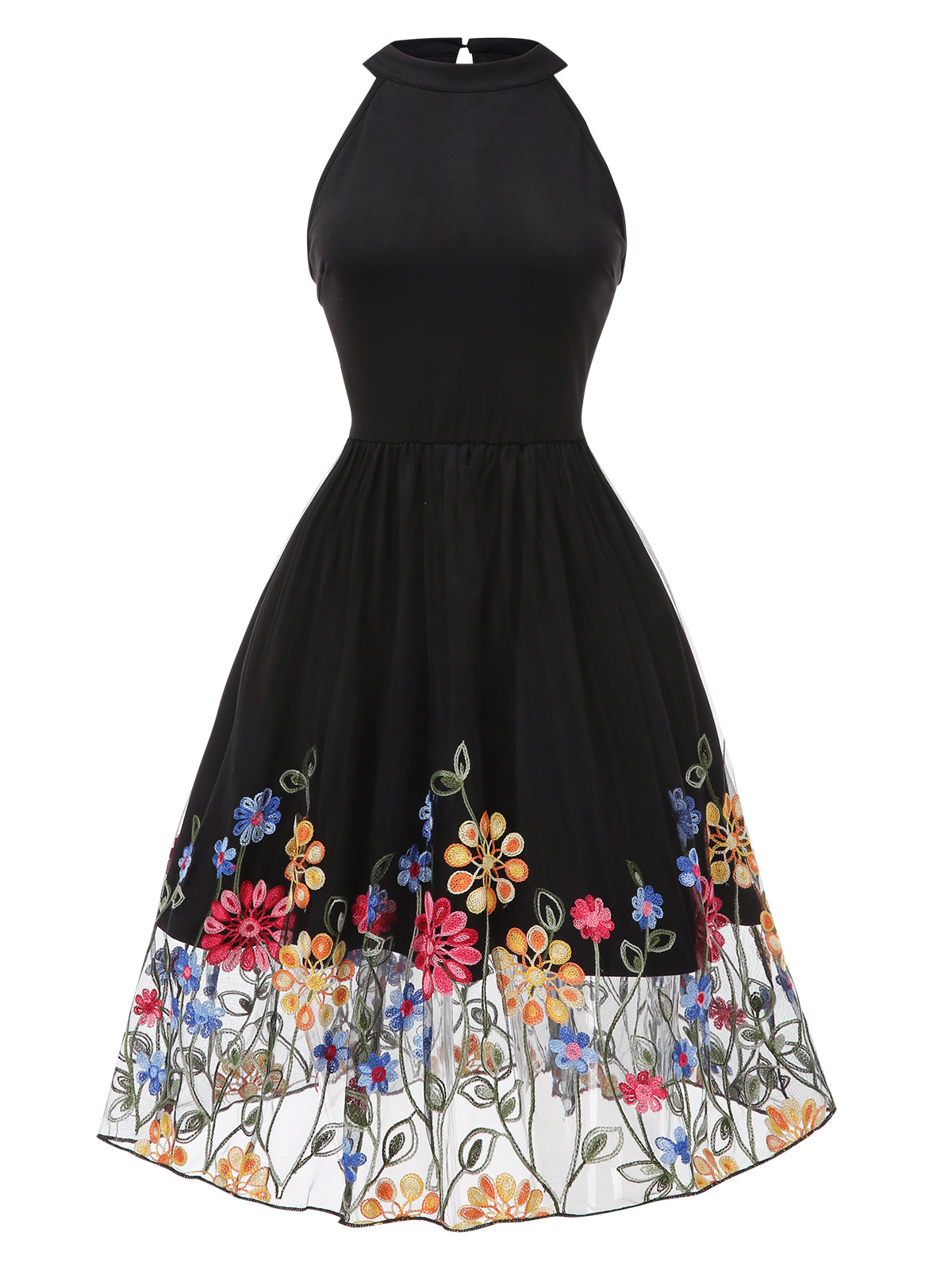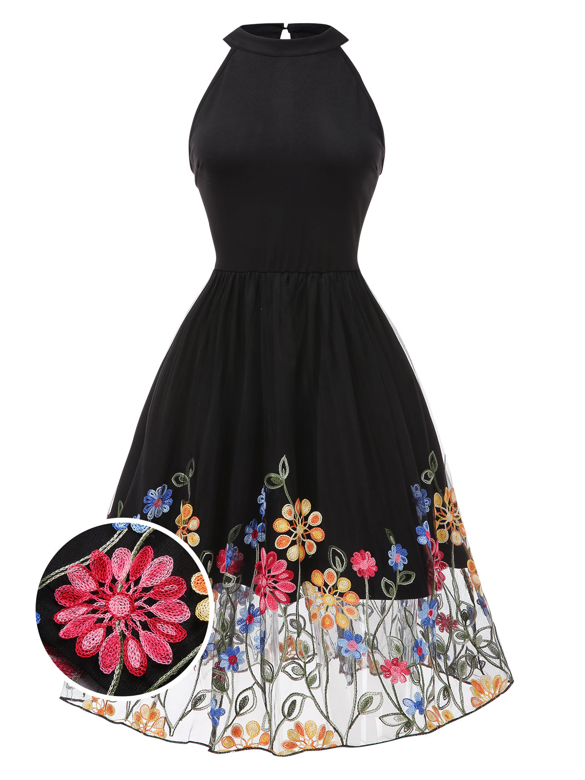 / Niebieska sukienka z dekoltem w serduszko z lat 50. XX wieku z kwiatowymi guzikami