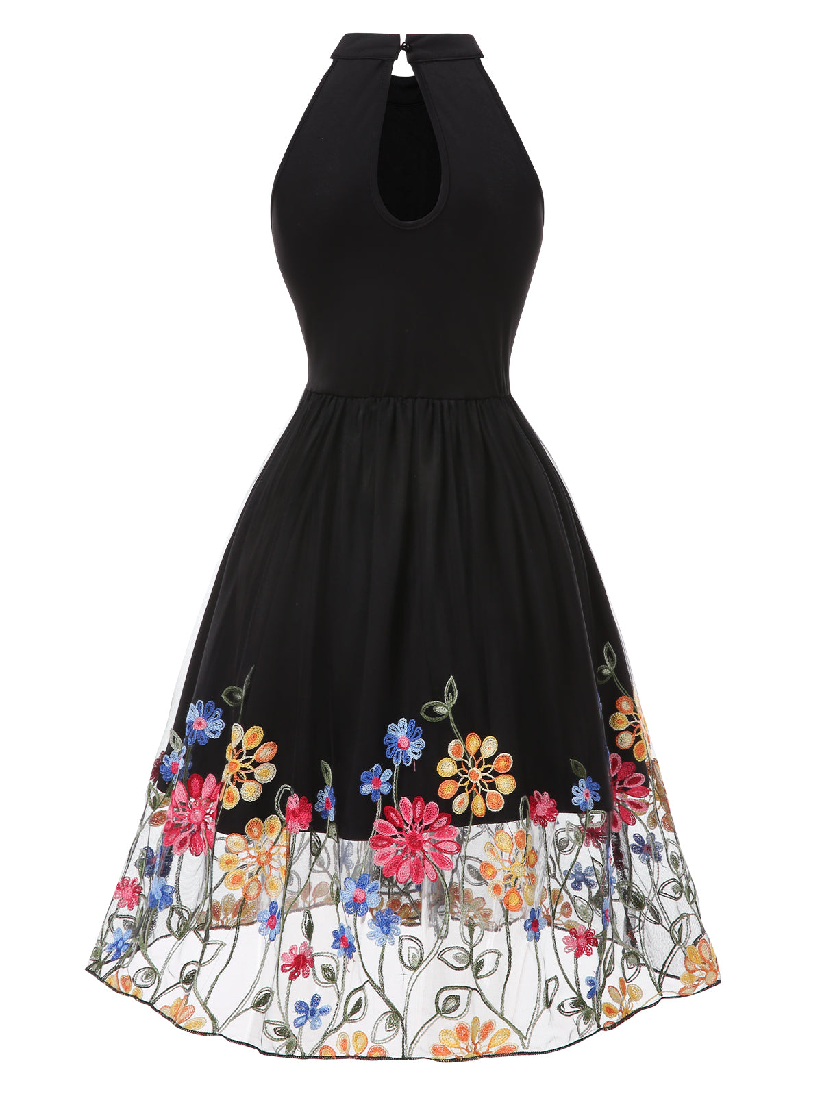 Niebieska sukienka z dekoltem w serduszko z lat 50. XX wieku z kwiatowymi guzikami