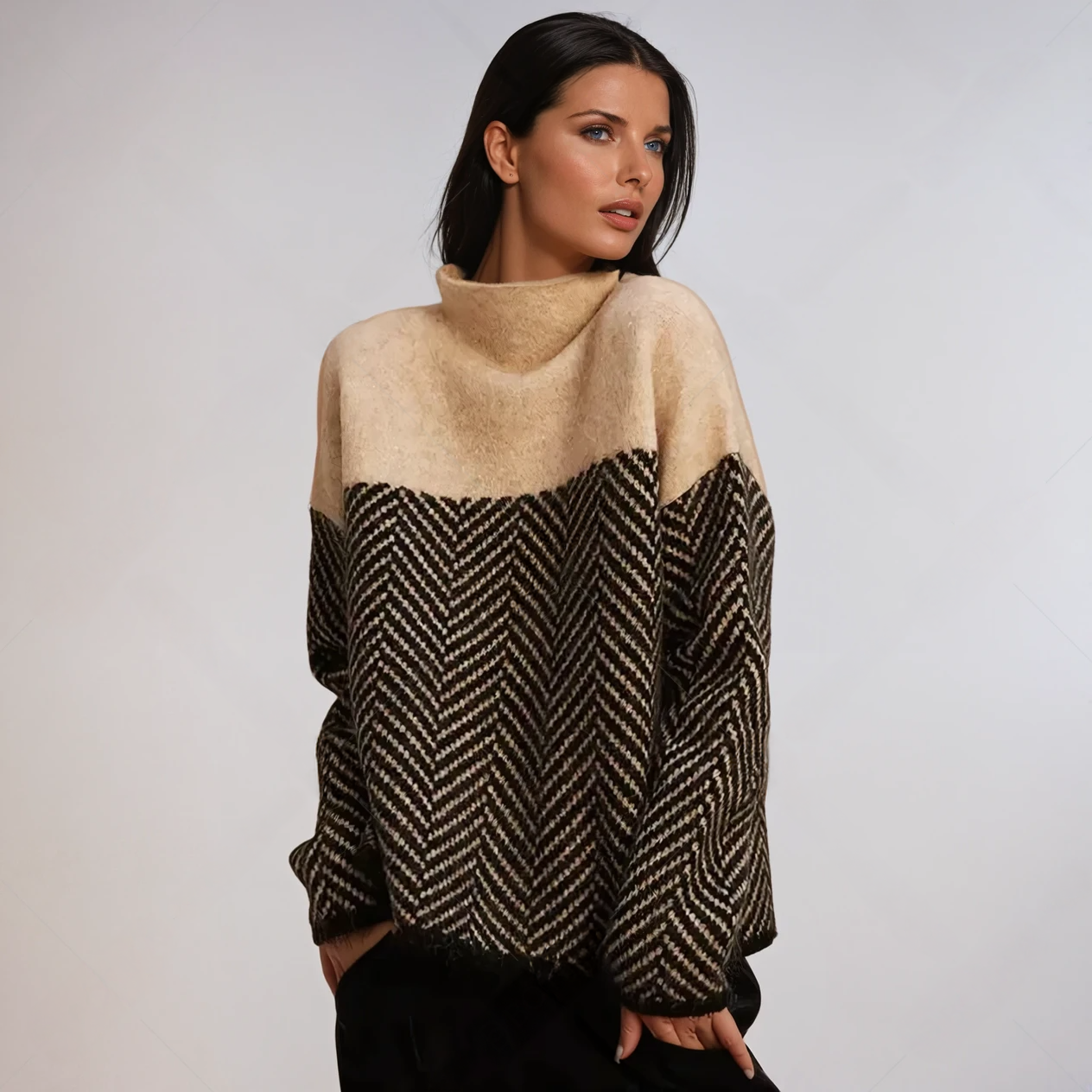 Odkryj naszą Louise | golf. Ten sweter z golfem jest miękki, miękki i przyjemny w dotyku, idealny dla osób ceniących nietypowe faktury. Golf z wzorem w jodełkę stanie się niezbędnym elementem Twojej garderoby. Poczuj komfort od szyi aż po nadgarstki.